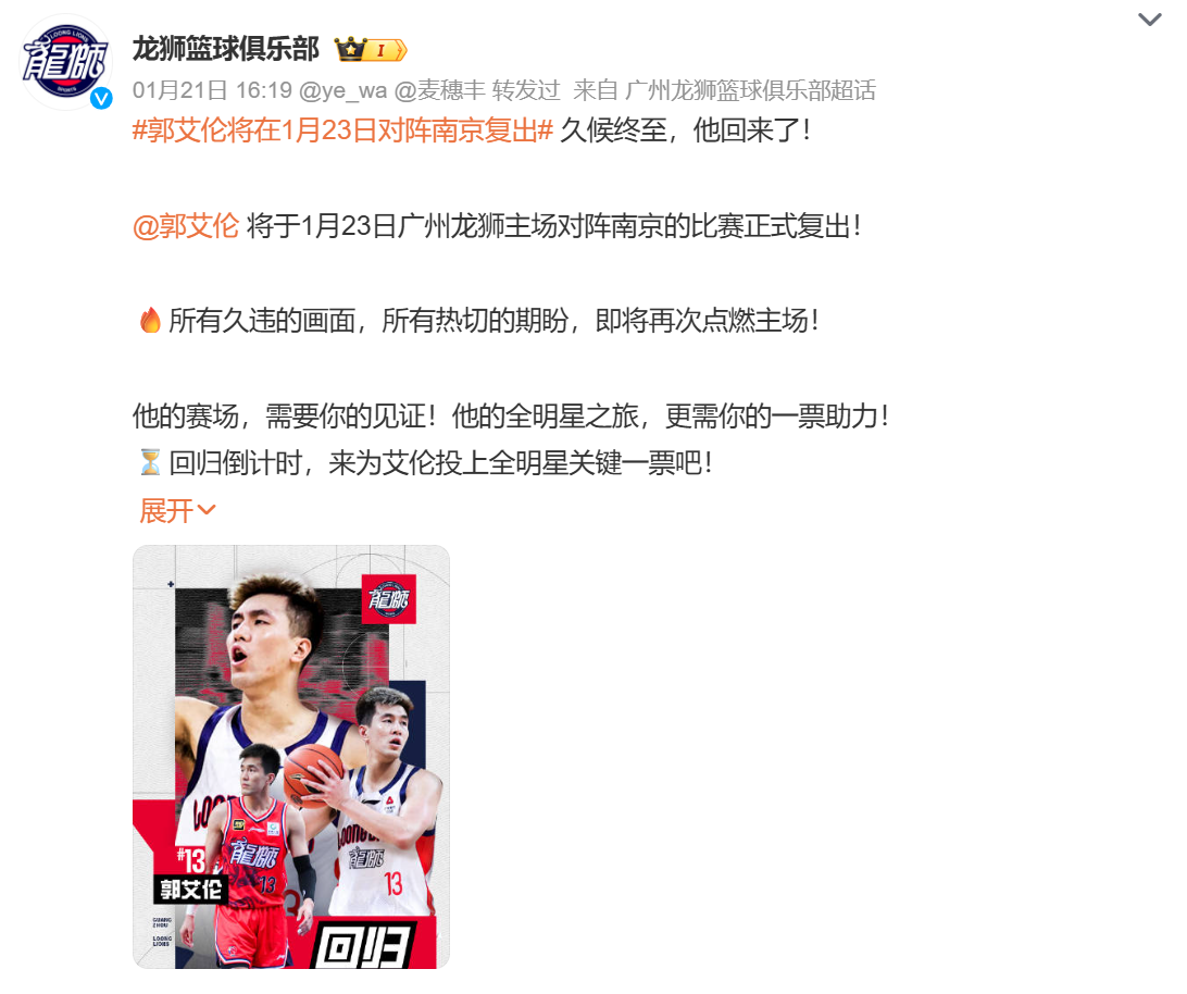 乐鱼集团-官宣复出!只打2场,郭艾伦还在争取全明星
